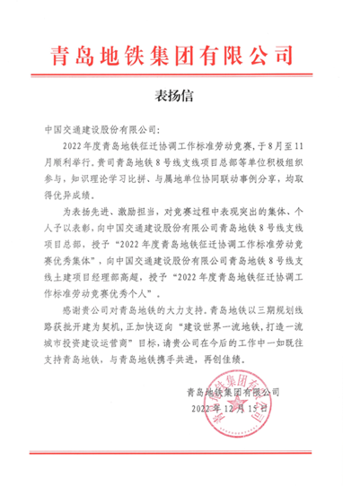 近日,中国交建青岛地铁8号线支线项目在“青岛地铁征迁协调工作标准劳动竞赛”中荣获优秀集体、优秀个人称号,并收到青岛地铁集团发来的表扬信。
